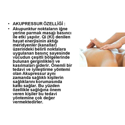 Akupunktur noktaların aiğne yerine parmak masajı ibasıncı ile etki yapılır.Qi (Kİ) denilen hayat enerjisinin aktığı meridyenler (kanallar) üzerindeki belirli noktalara uygulana basınç sayesinde vücudun çeşitli bölgelerinde bulunan gerginlikleri ve kasılmaları giderir.önemli bir tedavi ve iyileştirme yöntemi olan Akupressur aynı zamanda sağlıklı kişilerin sağlıklarını korumasında katkı sağlar. bu yüzden özellikle sağlığına önem veren kişiler bu tedavi yöntemine çok değer vermektedirler.
