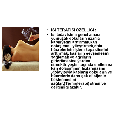 Isı tedavisinin genel amacı yumuşak dokuların uzama kabiliyetini arttırmak,kan dolaşımını iyileştirmek,doku hücrelerinin işlem kapasitesini arttırmak ,kasların gevşemesini sağlamak ve ağrıların giderilmesine yardım etmektir.yeşim taşında emilen ısı kan dolaşımının hızlanmasını ,dolayısıyla kasların dokuların ve hücrelerin daha çok oksijenle beslenmesini sağlar.(Termoterapi) stresi ve gerginliği azaltır.